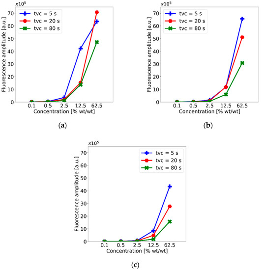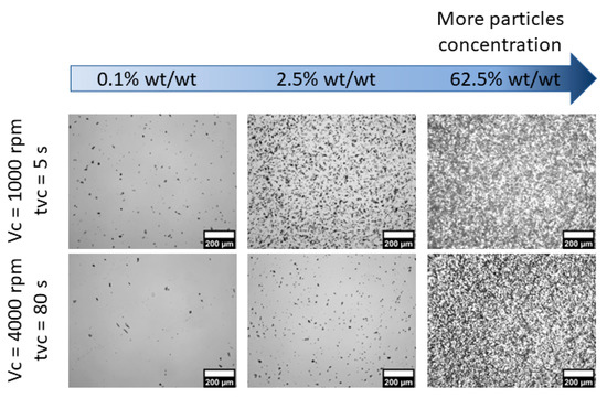 Adjustments to the fabrication parameters also affect the homogeneity of the phosphor particles within the membranes. As vc and tvc increased, membranes with lower particle concentrations per area were obtained. This is evidenced in the microscopy images included in Figure 7 obtained from membranes with a concentration of 2.5% wt./wt. with tvc ranging from 5 to 80 s, as well as for vc from 1000 to 4000 rpm. In contrast, an increase in particle concentration per area was observed upon increasing the phosphor concentration in the mix, as shown in Figure 8 for the thicker membranes (vc = 1000 rpm, tvc = 5 s), as well as for thinner membranes (vc = 4000 rpm, tvc = 80 s). Because the pressure exerted by the mix on the substrate is directly proportional to its density, it is reasonable to expect that thinner membranes will be obtained for denser polymer blends [25,26]. As shown in Table 2, increasing the phosphor concentration yields higher densities, as reflected by the trends observed in Figure 6 and Figure 8.