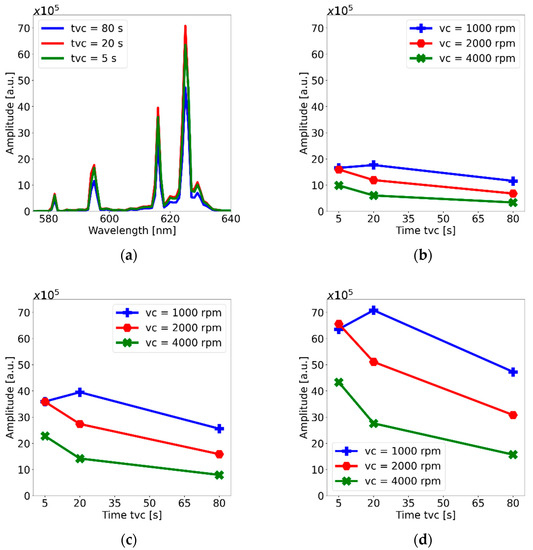 Fluorescence characterization was performed in a spectrofluorometer with a photomultiplier tube (Fluorolog-3, Horiba, FL3-22). Fluorescence signals from the membranes were obtained by placing them in a sample holder oriented at 45° of the optical axes of the instrument (i.e., the beam trajectory). The light source and the detector were further oriented perpendicularly to each other in order to avoid straight incidence of the pump source onto the detector; therefore, only the fluorescent signal from the membranes was registered. The source was set at a wavelength of 340 nm in coincidence with the absorption peak of the phosphor. Figure 9a shows a typical spectrum obtained from the PDMS-GOS:Eu membranes; this spectrum, in particular, showed the largest peak intensity and was obtained from the thicker membranes (vc = 1000 rpm) fabricated with the maximum particle concentration (62.5% wt./wt.). In agreement with previous reports [19,20], the three main fluorescence peaks were located at 595, 616 and 625 nm. The effects of the spin-coater parameters (vc and tvc) on the peak intensities for each wavelength are shown in Figure 9a–c. In general, an increase in velocity and spinning time yields a decrease in peak intensities, which might be related to a decrease in membrane thickness. However, in all cases, for the membranes fabricated using vc = 1000 rpm, the intensity seems to increase when tvc is increased from 5 to 20 s.