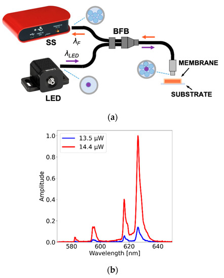 Typical spectral features of a PDMS-GOS:Eu membrane (62.5% wt./wt. concentration, vc = 1000 rpm, tvc = 20 s) as a function of the excitation power. (a) The setup used for spectral acquisition includes a bifurcated fiber bundle (BFB), an LED (340 nm) and a solid-state spectrometer (SS). (b) Fluorescence peaks captured with the bundle for two excitation powers (i.e., 13.5 and 14.4 μW) registered with the BFB (see text for further details).