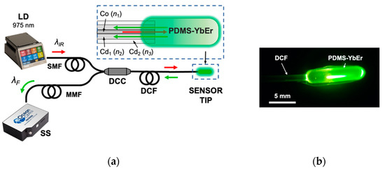 (a) Schematic representation of the experimental setup used to test an optical fiber temperature sensor. The sensing tip comprises PDMS-YbEr composite deposited on a double-cladding fiber (DCF). Using a double-cladding coupler (DCC), the fluorescent material is excited with the laser diode (LD, λIR), and the fluorescence signal (λF) is analyzed with a solid-state spectrometer (SS). The inset shows the structure of the DCF formed by a central core (Co) and two concentric claddings (Cd1 and Cd2). See text for further details. (b) Image of the sensor tip showing the green UC fluorescence from the PDMS-YbEr composite.
