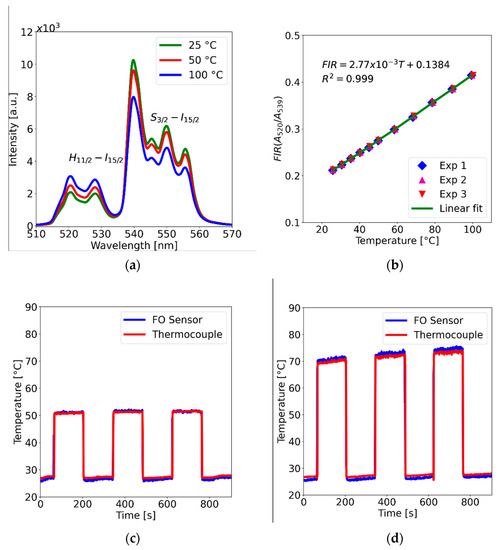 The spectral features of the fluorescence signal from the sensors were obtained using the setup depicted in Figure 12. The single-mode fiber (SMF) of a double-cladding coupler (DCC) is used to excite the PDMS-YbEr sensor tip, whereas the fluorescence is captured and sent through the multimode fiber (MMF) to a solid-state spectrometer (SS) for analysis. We used a fiber-coupled laser diode (LD) operating in the infrared range (λIR = 975 nm) to generate the green UC fluorescence signal (λF) from the polymer composite, and spectra at different temperatures were obtained by placing the sensor tip on the ceramic heater and TEC (not shown). Typical spectra obtained from a sensor are included in Figure 13a, showing the characteristic emission bands of the UC phosphor [16,17]. Because the spectral bands labelled H11/2–I15/2 and S3/2–I15/2 are thermally coupled, they can be used to calculate the fluorescence intensity ratio (FIR) as a function of temperature (see [16] and references therein). Upon integrating both bands and measuring their ratios at different temperatures, we obtained the plot presented in Figure 13b, showing that the FIR varies linearly with temperature. The plot includes results from three different experiments; evidently, the calculated FIR for each temperature is repeatable, with an error within 0.2%. Furthermore, FIR varies linearly with temperature, and both the linearity and sensitivity (ST = 2.77 × 10−3 °C−1, R2 = 0.999) are consistent with previous results obtained using multimode fiber sensors [16]. Similar results were obtained for different pump powers and for different probes fabricated following the same procedure, thereby validating the use of the FIR technique to eliminate noise and other spurious effects for fluorescence temperature measurements. Finally, we evaluated the ability of the sensors to track temperature changes when immersed in a liquid. This test was performed by immersing the sensing tip in water at room temperature (25 °C) and subsequently immersing the tip in a different container with water at a higher temperature. Results of this test involving switching the tip to containers with water at 50 °C and 70 °C are included in Figure 13c,d, respectively. For comparison, a commercial thermocouple was immersed along with the fiber sensor. The temperature readings from the two devices are very similar, providing evidence that the response time of the fluorescence fiber optic sensor is comparable to that of commercial thermocouples.
