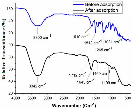 The ATR-FTIR spectra of CNP/EDTAPEI sorbent (Figure 2) show the characteristic peaks at 3300, 1610, 1512, 1265 and 1031 cm−1, corresponding to structural –OH, –C=O,–NH, –CO and –CN stretching vibrations of surface functional groups [34,35]. The CNP/EDTAPEI after metal ions adsorption were characterized by FTIR and showed a minor shift with a decrease in peak intensity, as shown in Figure 2. Figure 3A–C shows the TEM image of the CNP/EDTAPEI at different resolutions. It was observed that the sorbent shows the particle structure after ligand incorporation into cellulose units. The random distribution of nanofibers in the TEM image indicates particle formation. The sorbent shows amorphous nature ascribed to the selected area electron diffraction (SAED) pattern obtained from the TEM image (Figure 3C). The multi-point BET surface area of CNP/EDTAPEI observed after N2 sorption-desorption was found to be 254.8 m2 g−1.