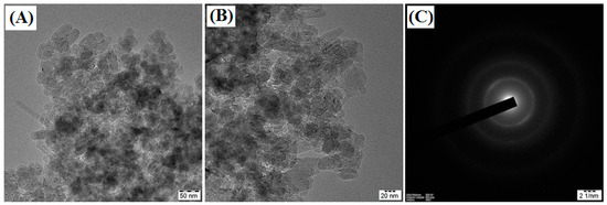 (A,B) HRTEM image of CNP/EDTAPEI sorbent at varying resolution illustrates the surface morphology of nanofibers; (C) SAED pattern of CNP/EDTAPEI sorbent.