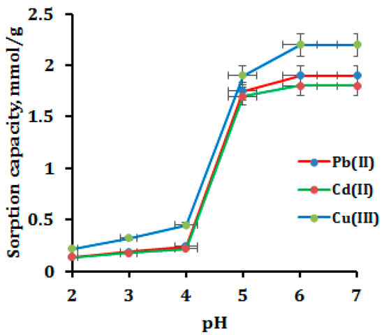 It is well known that the pH of the sample solution affects the surface charge of the adsorbent. Herein, we studied the adsorption of Pb(II), Cd(II) and Cu(II) at pH 2–7; beyond pH 7.0, they would form a precipitate. The adsorption trend of metal ions as a function of sample pH is shown in Figure 4. It is observed that, at low sample pH (pH 2–4), the adsorbent surface becomes protonated and becomes positively charged, resulting in low adsorption of metal ions. This is due to the fact that the positively charged surface has a weak electrostatic interaction between the chelating sites and divalent metal ions [36]; however, when increasing the sample pH, the adsorbent surface becomes deprotonated, and the surface becomes negatively charged, thus easily forming metal chelates at high sample pH 5–7. Beyond pH 7, at a basic medium (pH 8–10), the metal ions become precipitated and form hydroxides. The functionalized CNP showed maximum adsorption at a pH range of 5−7 and much less adsorption at pH 2–4. The adsorption of Cu(II) onto CNP/EDTAPEI occurs via the chelation of nitrogen-containing functional groups [37], whereas Pb(II) and Cd(II) formed complexes onto CNP/EDTAPEI, probably at oxygen-rich active sites along with nitrogen [37]. This is also in accordance with hard, soft, acid and base theory [38,39]. Moreover, the prepared sorbent simultaneous adsorption of all three studied metal ions in a wider pH range due to the availability of various combinations of functional groups. In addition, to sample preparation, the CNP/EDTAPEI adsorbents can be used for the simultaneous removal of heavy metal ions at a common pH value of 5−6, thus making it useful in water filtration and purification.