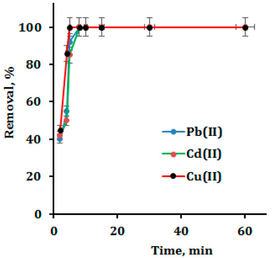 The sorbent–sorbate contact time was investigated and improved in order to obtain maximal adsorption. In an Erlenmeyer flask, 50 mg of CNP/EDTAPEI was agitated for 2 to 60 min at pH 6 with 50 mL of metal ions (10 mg L−1). ICP-OES was used to evaluate the metal ion that was left in the supernatant. The data collected are shown in Figure 5. It was discovered that Pb(II) and Cd(II) were entirely removed after 8 min of equilibration, while Cu(II) was eliminated after a shorter contact period of 5 min. This may be because the nitrogen functionality has a strong propensity to attach to Cu(II), then Pb(II) and Cd (II) [37,40,41]. Because of its high chelating efficiency and good accessibility to metal ions, the CNP/EDTAPEI exhibits quicker metal ion adsorption. This potential use in the preconcentration of trace metal ions from actual samples is suggested by its quicker adsorption rate.