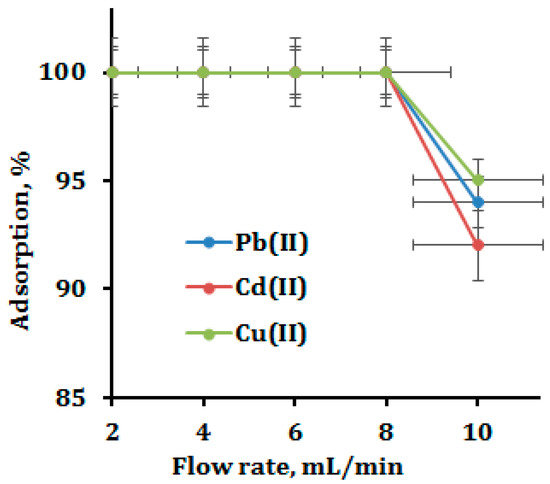 Sample flow rate optimization is equally significant to other parameters. The ideal sample flow enables full metal ion extraction from intricate matrices. Model solutions (vol. 100 mL; metal ion 10 µg; pH 6.0) were repeatedly cycled through the column at varied flows between 2- and 10-mL min−1 in order to analyze and improve the sample flow in the column. Figure 6 displays the plotted and acquired findings. Up to a flow rate of 8 mL min−1, which is among the highest reported cellulose-based column experiments described in the prior literature, the entire extraction of feed metal ions (Pb, Cd and Cu) was unaffected. Given the rapid flow rate and full extraction of metal ions, functionalized CNP must have a high affinity. The recovery of metal ions gradually declined by 5–10% above the 8 mL min−1 flow rate. Such decreased adsorption at greater sample flows may be caused by insufficient metal ion interaction with the functionalized CNP’s active sites. For the column adsorption tests, a sample flow rate of 8 mL min−1 for all the metal ions was chosen and used.