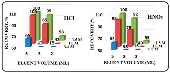 A crucial factor in accurately estimating the trace analyte ion concentrations in the solution is the quantitative recovery of the adsorbed analyte ions. A series of elution studies were conducted using functionalized CNP adsorbents to remove the analyte ions that had been retained. Figure 7 displays the outcomes for the elution of sorbed metal ions by various mineral acids, including nitric acid (HNO3) and hydrochloric acid (HCl), at various volumes (2–5 mL) and concentrations (0.5–1.5 M). We found that 5 mL of 1 M HCl was high enough to completely desorb (with a recovery rate of >99%) all analyte ions. In contrast, 85% of the sorbed metal ions are eluted by 3 mL of 1 M HCl. Then, 5 mL of hydrochloric acid was utilized as the eluting agent for additional research. Using the same column bed for many adsorption–elution tests, the reusability of functionalized CNP was examined. Up to the 60th cycle, the column was successfully employed, and after that, a progressive decline in sorption was seen. In particular, a 10–15% decline in all examined metal ion recoveries was seen in the cycles after 60. This decrease in recovery could be brought on by ligand leaching or degradation from the CNP sorbent. In conclusion, it was possible to extract and preconcentrate metal ions using functionalized CNP composites in many cycles.
