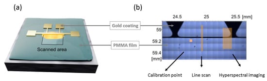 (a) Schematic representation of the heating device deposited on top of the polymer film. (b) Optical transmission image of the sample, showing the metallic wire in black with the three infrared measurement areas highlighted in orange.