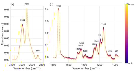 While infrared (IR) spectroscopy relies on the same effect of temperature on the phonon modes, IR signals are often stronger than Raman signals and can be calibrated for quantitative measurements using multivariate chemometric methods. Temperature-dependent IR spectra have mainly been employed in the determination of the transition temperature and conformational energy of macromolecules [,,,]. This method probes subtle changes in the intensities of individual infrared absorbance bands or band ratios with respect to temperature [,]. A potential model system for incorporating variable-temperature Fourier-transform infrared (FTIR) spectroscopy is poly(methyl methacrylate) (PMMA), as the temperature dependence of its infrared absorbance band intensities have been studied in detail in recent years [,,]. For example, the conformational energies for the PMMA backbone and side chains were derived by analyzing changes in the infrared absorbance of PMMA as a function of temperature [,]. In another work, the glass transition temperature was derived by analyzing changes in the reflectivity of PMMA thin films []. Painter et al. studied the thermal transitions of PMMA using the change in width and shape of absorbance bands with increasing temperature []. Some PMMA absorbance bands have also been found to be temperature-dependent [,].