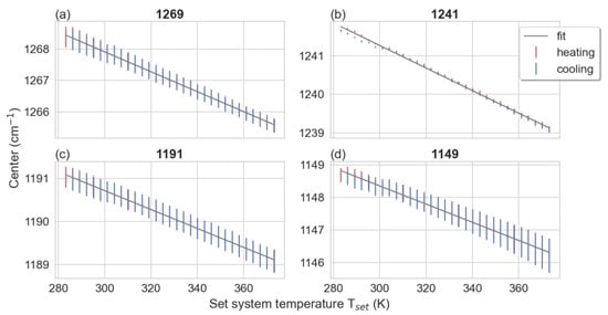 The temperature dependencies of the most temperature sensitive peaks (1269, 1241, 1191, and 1149 cm−1) are shown in Figure 3. All four peaks possess a linear relationship between Tset and the infrared peak position (IPP) over the measured temperature range. The resulting temperature dependencies (the slope of the linear fit dIPP/dTset) for all peaks are shown in Figures S8 and S9; they have been summarized in Table 1, and are used for the LR approach for the temperature determination. The pronounced redshift of the peaks at 1269, 1241, 1191, and 1149 cm−1 have been previously reported and are in good agreement with our results (Figure 3) [,].