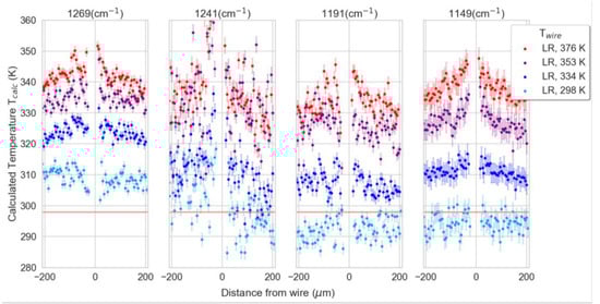 First, the calculated temperatures (Tcalc) for the measurements at room temperature (298 K) were compared to the set wire temperature (Twire). The mean temperatures for each of these room temperature measurement points were calculated. The resulting mean values (given with standard derivation) are 309 ± 3, 302 ± 8, 291 ± 4, and 294 ± 3 K for the peaks at 1269, 1241, 1191, and 1149 cm−1, respectively.