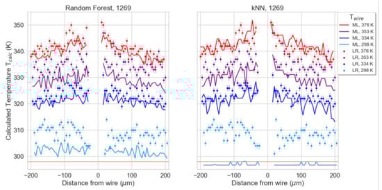 Temperatures (Tcalc) predicted with linear regression (LR) for the peak at 1269 cm−1 indicated by “●”-markers and temperatures predicted by the machine learning (ML) approaches indicated by lines, using the random forest (left) and k-NN (right) algorithms. The data were measured with the gold wire temperature (Twire) at room temperature (298 K) and heated to 334, 353, and 376 K. Room temperature is indicated with horizontal red lines.