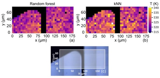 Here, we set the wire temperature to 376 K, measured by the resistance of the wire. For each measurement point, the temperature was predicted using the random forest (Figure 6a) and the k-NN (Figure 6b) algorithms. As previously observed in the line scan predictions (Figure 5), the temperatures predicted by the random forest algorithm were slightly lower than those predicted by the k-NN algorithm. However, this technique allows for a very quick and direct generation of a thermal map using the raw signal, avoiding the individual fitting of all 540 spectra while considering the entirety of the frequency windows rather than a single peak.