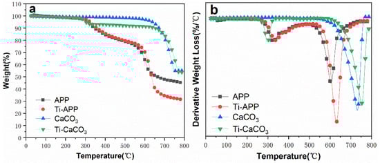 After modification, Ti-CaCO3 turned to decompose in two steps similar to APP during the temperature programmed process of 25–800 °C, and its heat resistance also changed obviously. The initial decomposition temperature (T-10%) was advanced by 21 °C which may be caused by the decomposition of the titanate coupling agent coated on its surface, but the fastest decomposition temperature (Tmax) in the second step was delayed by 21 °C indicating that the decomposition process of Ti-CaCO3 is more gradual, and the addition of titanate slows down its decomposition process.