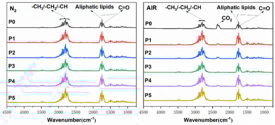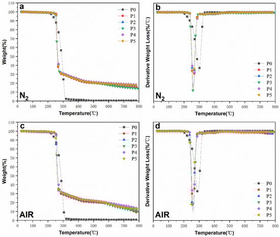 In the air atmosphere, P0 and P4 composites have an obvious CO2 absorption peak (2358 cm−1), which may be due to the participation of oxygen, prompting a part of formaldehyde or small molecular chain alkanes to completely burn, thus producing CO2. Moreover, the CO2 absorption peak of P4 was significantly lower than that of P0 due to the addition of flame retardant. The results show that the addition of flame-retardant leads to incomplete combustion of the material and locks more C in the carbon layer, thus effectively reducing the corrosion of the gas volatiles. In addition, the decomposition is basically the same as that in the nitrogen atmosphere.