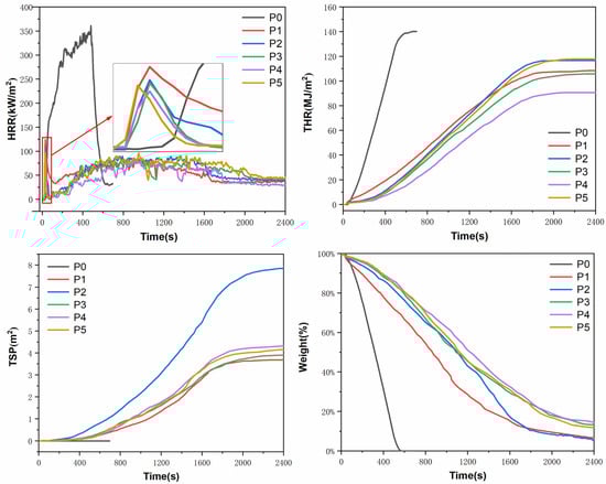 Figure 8, P0 was ignited at 43 s, the peak heat release rate (Pk HRR) reached 361.2 kW/m