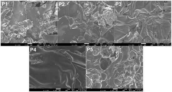 Figure 11, there are many pores in the carbon layer of P1, accompanied by a few cracks. P2 shows a fragmented carbon layer like P1, but basically has no holes and still has a certain degree of compactness. It may be related to its gas phase flame retardant mechanism. The carbon layer of P3 is much denser than that mentioned above, with very few cracks and sporadic holes in the field of view. This is closely related to its condensed phase flame retardant mechanism. In the field of view of P4, there are basically no holes and cracks, and the surface of the carbon layer is smooth and flat, which is consistent with the results of its flame-retardant properties. The carbon layer of P5 has a few holes, but basically no cracks.