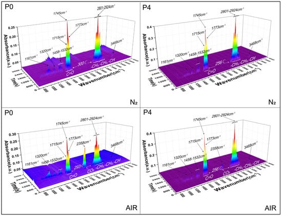It can be found from the 3D figure that the types of gas volatiles of P0 and P4 composites are basically the same in the nitrogen atmosphere. Mainly carbonyl compounds (CH2O, 1715 cm−1, and 1773 cm−1), aliphatic lipids (1745 cm−1), and hydrocarbon groups such as methyl and ethyl groups (2801–2924 cm−1). The results show that FR-POM composites crack mainly in the form of formaldehyde and various small molecular chain alkanes under the condition of high temperatures without oxygen. In addition, the absorption peaks of C-O (1161 cm−1), the symmetric stretching vibration of -CH3 (1320 cm−1), the skeleton stretching vibration of aromatic hydrocarbons (1458–1532 cm−1), and the absorption of N-H (3468 cm−1) can still be found in the 3D diagram.