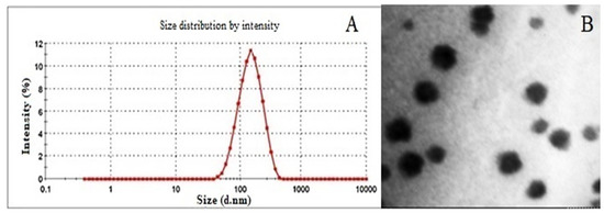 (A) Particle size (114.9 nm) of optimized formulation measured by Malvern Zetasizer 4 (Malvern Instruments). (B) TEM photograph of Cur-SLNs showing spherical shape and smooth surface.