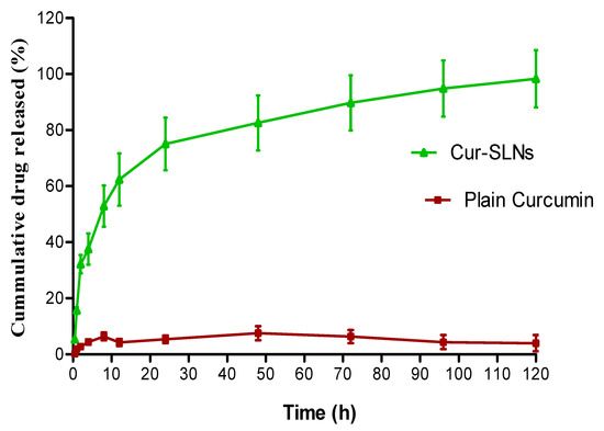 The dialysis bag diffusion technique was used to investigate curcumin release from Cur-SLNs and unformulated/plain curcumin. The rate of curcumin release from the formulation and its appearance in the dissolution media was determined by the drug’s partition coefficients between the lipid phase and aqueous environment in the dialysis bag as well as by drug diffusion across the membrane. The dialysis bag retained the nanoparticles and enabled the diffusion of the drug immediately into dissolution media. To depict the drug release pattern, the % cumulative drug release vs. time is shown in Figure 3. The % cumulative release of curcumin from Cur-SLNs was much higher than from plain curcumin powder. The release of curcumin that were adsorbed on the surface of the nanoparticles triggered the Cur-SLNs to have a burst effect, with about 32.85% of the drug being released in the first 2 h followed by a sustained release phase for a further 120 h. The diffusion of drug molecules through the lipid matrix of SLNs into the dissolution media may be the cause of the sustained release effect. Similar results (initial burst effect followed by sustained release effect from a polymeric nanocarrier) have been reported in the literature [40], justify our findings.