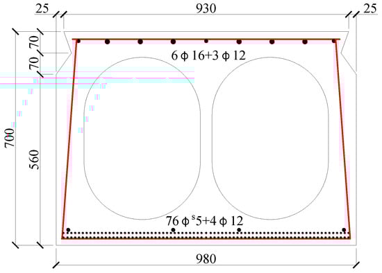 The prestressed concrete hollow-section beam investigated in this study was removed from an old simple-support assembly precast prestressed concrete bridge. This bridge was designed in accordance with China code JTG D62-85 [39], completed and formally operated in 1987. The design load was class 20-automobile and class 100-trailer. During its service of about 25 years, the design code was renewed twice as JTG D62-2004 and JTG 3362 [40,41]. However, the bridge does not meet the safety requirement of the current code, and need to be repaired and strengthening by rational technology. Figure 1 presents the geometry of the cross-section and the detailed reinforcement. The nominal width of the cross-section was 1000 mm, and the depth was 700 mm. The length of the beam was 16 m, and the span was 15.5 m. The longitudinal tensile reinforcement was 76фs5 prestressed steel wire. A total of 4ф12 plane hot-rolled steel bars were placed in the tensile zone, 6ф16 + 3ф12 plane hot-rolled steel bars were placed in the compressive zone, and ф6 plane hot-rolled steel stirrups in spacing from 150 mm to 200 mm were used to form a reinforcement skeleton. The concrete cover of the outside reinforcements was 28 mm.