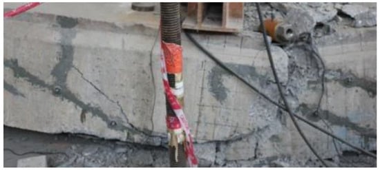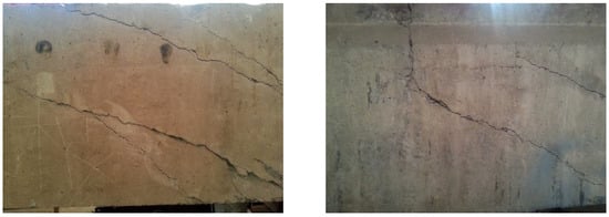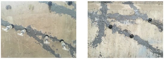 To maintain the integrity of the proto beam, the existed cracks should be repaired before strengthening. Based on the specification of China code GB 50367 [9], the epoxy adhesive was used to fill the cracks, as presented in Figure 3. The adhesive condition was detected by the impact echo method specified in China code JGJ/T 411 [45]. The repair quality met the requirement of concrete integrity.