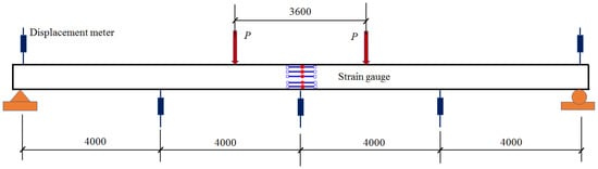 Although the existing cracks were repaired by filling epoxy adhesive, it was hard to avoid the stiffness degradation of the proto beam. To evaluate the degree of stiffness degradation, a four-point bending test with a pure bending length of 3.6 m was conducted, as presented in Figure 4. The deflection of the repaired beam was measured by the displacement meters installed at one-fourth of the span, mid-span and the supports. The concrete strains at the mid-span section were measured by the strain gauges longitudinally installed along depth of the section. Test data were collected by an automatic data acquisition instrument.