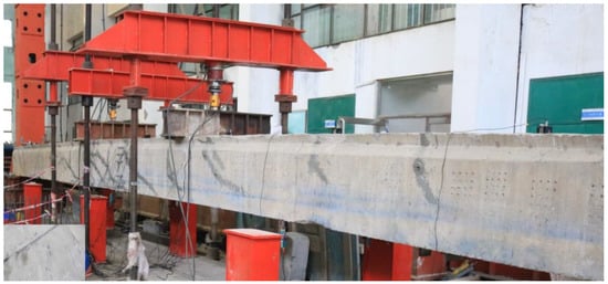 Based on the specification of China code JTG 3362 [41], the maximum transverse distribution coefficient of moving vehicles on the old bridge was 0.238. At the serviceability limit state and the bearing capacity limit state, the target moment at the mid-span section were 892.0 kN·m and 955.0 kN·m, respectively. Therefore, the corresponding applied moments were 653.5 kN·m and 716.5 kN·m, calculated by subtracting the bending moment caused by self-weight.