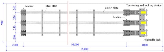 The prestressing of CFRP plates was used to strengthen the repaired beam. The design method specified in China code GB 50367 was applied to determine the amount of CFRP plates [9]. Based on the design principle of ensuring under-reinforced failure mode for the repaired beam after strengthening, three prestressed CFRP plates were used in this study. Each plate was 54 mm wide, 1.4 mm thick, and 10 m long. The tensile strength and the modulus of elasticity of prestressed CFRP plate were 2400 MPa and 1.60 × 105 MPa, respectively. The tensioning stress was 720 MPa, 30% of the ultimate tensile strength of the CFRP plate. The effective prestress was 533.3 MPa which determined by deducting the prestress losses due to the anchor deformation and locking shrinkage, and the relaxation of CFRP plate. Therefore, according to the formula specified in China code GB 50367 [9], the bending moments at mid-span were increased by 79.0 kN·m and 167.0 kN·m at concrete cracking and ultimate bearing conditions, respectively.
