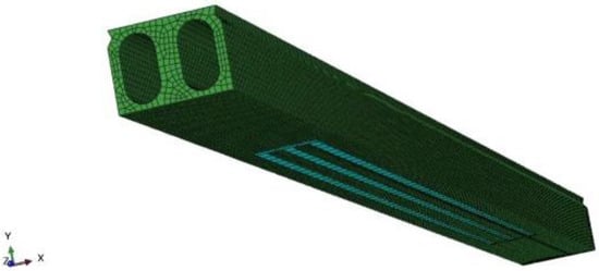 The C3D8R element was used for concrete, which was a eight-node linear block with reduced integration. The S4R element was used for the CFRP plates, which was a four-node doubly curved thin shell with reduced integration. The T3D2 element was used for the steel bars, and the nonlinear spring element Spring2 was used to simulate the bond-slip between prestressed steel wire and concrete. The cohesive contact was used to simulate the interfaces between CFRP plates and concrete. In view of the sectional dimension of the beam, most of the concrete elements were divided in sizes of 100 mm. Those with the size of 50 mm were also used to simulate the hollow to reduce stress concentration.