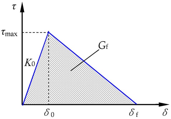 Where δ is the effective opening displacement; τ is the effective traction; K0 is the initial stiffness; τmax is the shear bond strength; Gf is the fracture energy; and τmax and Gf are calculated by Formulas (12) and (13), respectively [52].