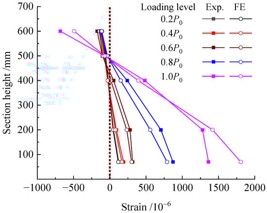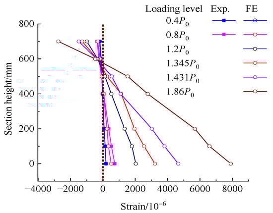 The experimental and predicted longitudinal concrete strains at mid-span section are shown in Figure 10; the number before the letter represents the ratio of applied load to P0. It can be seen that the longitudinal strains of concrete linearly varied at the mid-span section of the repaired beam under loads below the cracking load of 0.6P0. Agreement presents well between experimental and FE analytical values at this stage. However, the tensile strains of concrete had a larger difference between the values of experiment and the FE analysis when the load was more than the cracking load. This resulted from the cracks due to the tensile stress exceeding the tensile strength of concrete, while the homogeneous tensile strength of concrete was disturbed by the repaired existing cracks in the repaired beam. Generally, the strain maintains a plane at the section of the repaired beam under service load P0.
