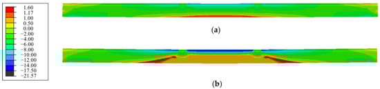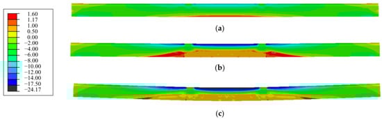 The concrete stresses distribution along span of the repaired beam under the cracking load and the load P0 at serviceability limit state are shown in Figure 11. Due to the tensile strength of concrete varying from 1.17 MPa to 1.60 MPa based on the detection of the repaired beam, the longitudinal tensile stress was over 1.17 MPa as expressed by RED in the nephogram. As seen in Figure 11a, the longitudinal tensile stress at pure bending sections reached 1.17 MPa, which was the tensile strength of concrete in this area. Thus, the concrete cracks were consistent with the experimental phenomenon of the appearance of vertical macro-cracks in this area, and the predicted load at cracking state was 66 kN (0.6P0) for the repaired beam.