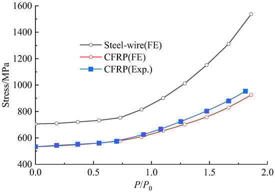 The comparison of the experiment with the FE analytical results of the tensile stress of prestressed CFRP plates, and the FE analytical results of the tensile stress of prestressed steel wire are presented in Figure 16. The experimental stress of prestressed CFRP plates was taken as the average measured for the three CFRP plates prestressed and bonded on the bottom surface of the repaired beam. Similar stress variation existed for the prestressed CFRP plates. Before the cracking of concrete at the load 0.73P0, the stress linearly varied with the increase in load. Then, the stress tended to increase quickly, due to the loss of the ability of the cracked concrete to bear tensile stress which was transferred to the CFRP plates and steel wires. The experimental and FE analytical stress of the CFRP plates were 953.7 MPa and 919.5 MPa at the ultimate load. This also demonstrated the validity of the FE model with a difference of 3.6% from the experiment.