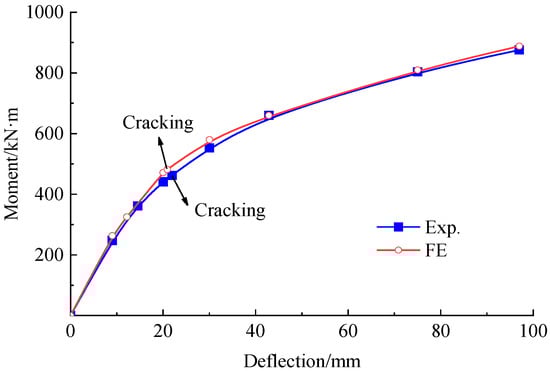 As presented in Figure 17, good agreement is given in the mid-span deflection obtained by the FE analysis and the experiment. The experimental moment at cracking and ultimate states for the strengthened beam were 462 kN·m and 875.7 kN·m, respectively. The corresponded FE analytical values were 481.8 kN·m and 888.4 kN·m. The ultimate moment was close to the target of 883.5 kN·m.