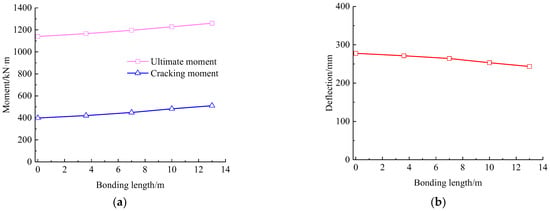 Based on the verification of test results with the FE analysis, the concrete in the compression zone of the strengthened beam was crushed after experiencing large deflections. In this process, of the many cracks appeared in the pure bending segment play a dominate role in the failure of the beam. Therefore, the bonding length of prestressed CFRP plates should be greater than the pure bending segment, i.e., 3.6 m. In this section, the bonding length of prestressed CFRP plates is set to 3.6 m, 7 m, 10 m, and 13 m, with the repaired beam as a reference. Four FE models are built on basis of Section 4 and the analytical results presenting the effect of CFRP bonding length on the cracking moment, the ultimate moment, and corresponded mid-span deflection are shown in Figure 18.