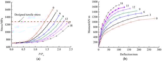 Figure 19 presents the tensile stresses of prestressed steel wires and the mid-span deflection changed with the load for the beams with different number of prestressed CFRP plates. From Figure 19a, similar trend of the stress of prestressed steel wire presents with different amount of prestressed CFRP plates. However, the stress of prestressed steel wires slowly increases with the increased number of prestressed CFRP plates. From Figure 19b, the mid-span deflection is obviously lowered with an increase in the amount of prestressed CFRP plates, while the increase in the amount of prestressed CFRP plates leads to a rise in the cracking moment. This improves the serviceability of the strengthened beam at the load P0 with a smaller deflection due to the enhancement of concrete cracking resistance. With the number of prestressed CFRP plates increased from 3 to 12, the cracking moment increases by 65.6% in total, and each prestressed CFRP plate increases the cracking moment by 7.3%. When the number of prestressed CFRP plates is no less than 12, the crack of concrete can be avoided for the strengthened beam at serviceability limit state.