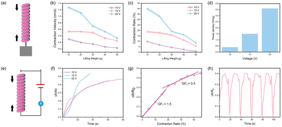 - Wang, R.; Shen, Y.; Qian, D.; Sun, J.; Zhou, X.; Wang, W.; Liu, Z. Tensile and Torsional Elastomer Fiber Artificial Muscle by Entropic Elasticity with Thermo-Piezoresistive Sensing of Strain and Rotation by a Single Electric Signal. Mater. Horiz. 2020, 7, 3305–3315. [Google Scholar] [CrossRef]