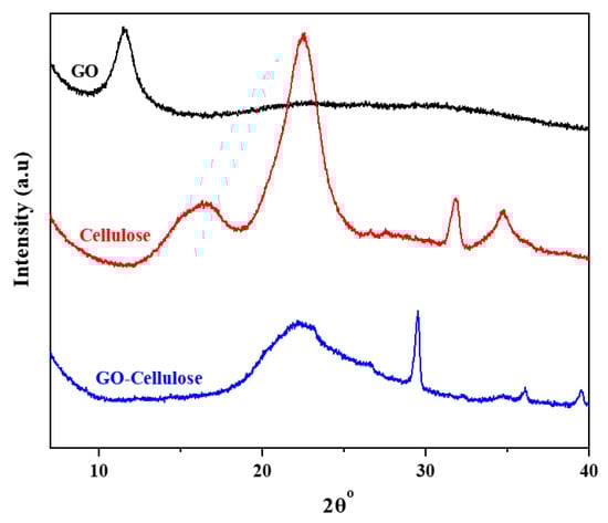 The XRD patterns of GO, extracted cellulose, and GO cellulose are shown in Figure 2. GO has a characteristic peak at 2θ = 11.4° corresponding to the (002) plane which is attributed to the existence of covalently bound oxygen-containing functional groups and the quantity of absorbed water [13,38]. Extracted cellulose presents characteristic peaks at 2θ = 16.3°, 22.5°, and 34.8°, corresponding to 110, 200, and 004 crystal planes, respectively [39]. The peak at 31.8° is due to moisture content, which is supported by the literature-reported water peak in XRD [40,41].The diffraction peaks of the GO–cellulose composite observed at 2θ = 22.2°, 29.5°, and 35.9° are almost consistent with those of the pure extracted cellulose. The characteristic peak of GO at 11.4° disappears completely in the GO–cellulose composite, indicating the removal of oxygen-containing groups from GO, which formed the hydrogen bonding with the -OH groups of cellulose, illustrating the successful combination of GO and cellulose [13]. Moreover, the hydrogen bond was also confirmed between the GO and extracted cellulose.Furthermore, the peak areas at 2θ = 16.3° and 22.2° confirm the amorphous nature of the cellulose and GO–cellulose composite. In addition, compared with the crystalline regions, the amorphous regions of GO–cellulose composites offer higher chemical reactivity [26].