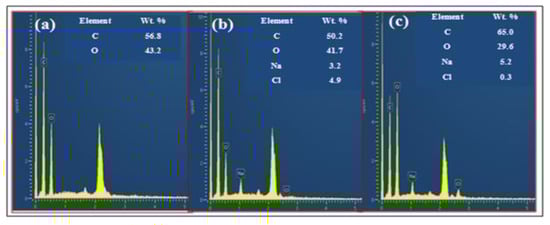 EDS spectra of GO (a),extracted cellulose (b), and GO–cellulose composite (c).