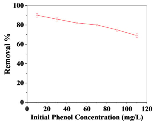 Figure 7shows the effect of the initial concentration of phenol on the adsorption of phenol on the GO–cellulose composite. In our investigation, the removal percentage of phenol was studied by varying the initial phenol concentration from 10–110 mg/L (10 mg/L, 30 mg/L, 50 mg/L, 70 mg/L, 90 mg/L, and 110 mg/L) at optimized reaction conditions, i.e., at constant time (40 min), constant pH (7), constant adsorbent quantity (0.125 g/30 mL), and at constant temperature (50 °C).As presented in Figure 7, phenol’s removal percentage decreased from 90% to 69% with increasing initial concentration of phenol from 10–110 mg/L. A similar observation was reported by Das et al. [47,48] for the adsorption of phenol using rice husk ash and guava tree bark as adsorbents.