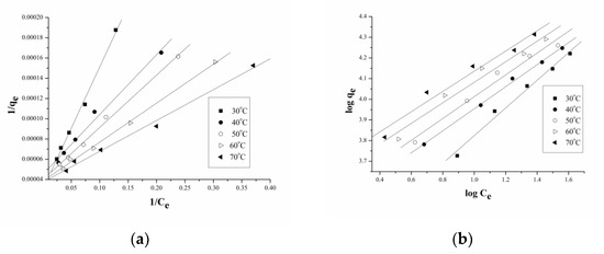 where Q°, b are Langmuir parameters and 1/n, Kf are Freundlich parameters. The data were fitted to both the isotherm models and the plots obtained were straight lines (Figure 8a,b). The values obtained for the correlation coefficient (R2) clearly indicate that the data were better fitted to Langmuir isotherms at all temperatures (Table 5). A similar observation was reported by Singh et al. [59] for the adsorption of Rhodamine B dye using powdered banana peel as the adsorbent. The better applicability of the Langmuir model was also reported for the adsorption of brilliant green dye on activated carbon prepared using banana peels [60].
