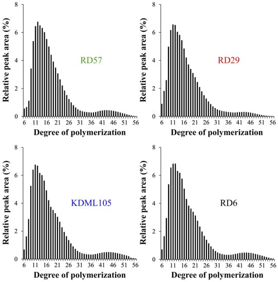 In this study, the sensitivity of the HPAEC-PAD system was able to resolve amylopectin branch chains with DP ≤ 56. The computed peak area ratios of amylopectin branch chain types, which were categorized into A chains (DP 6–12), B1 chains (DP 13–24), B2 chains (DP 25–36), and B3+ chains (DP ≥ 37), were shown in Table 2 [2]. Among the four studied cultivars, RD57 starch possessed the smallest (27.42 ± 0.28%) and largest (57.31 ± 0.10%) amount of short A chains (DP 6–12) and B1 chains (DP 13–24), respectively, whereas the KDML105 starch had the lowest proportion (50.85 ± 0.30%) of B1 chains (DP 13–24) (Table 2). The RD29 starch contained the highest proportions (9.57 ± 0.06%) of B2 chains (DP 25–36), whereas its longer B3+ chains (DP ≥ 37) showed the lowest proportion (4.56 ± 0.33%) (Table 2). This was consistent with the shortest CL of RD29 amylopectin branches, which was 17.11 ± 0.12 AGU compared to 18.12 ± 0.12, 18.05 ± 0.22, and 17.96 ± 0.18 AGU of RD57, KDML105, and RD6 amylopectin branches, respectively (Table 2). Consistently, the normalized chromatogram of the amylopectin CLD digested from RD29 rice starch showed less B3+ chain proportion, and was obviously different from other rice starches (Figure 1).