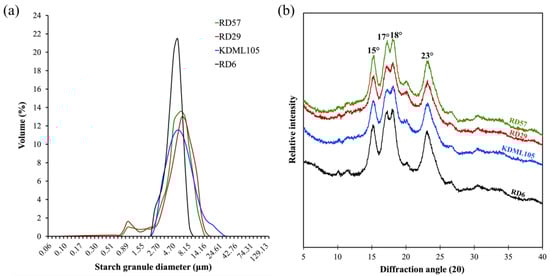 Structural characterization of starch from the caryopses of four Thai commercial rice cultivars differing in pasting properties. (a) Starch granule size distribution; (b) X-ray diffraction patterns of starch granules.