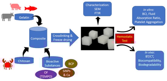 The following Figure 2 shows the schematic view of CG-based composite material studies combined with OF, SiNPs, Ca, and BCP. The next step was in vitro characterization test using SEM and FTIR, and the final step was the in vivo study to analyze the hemostatic ability of the materials.