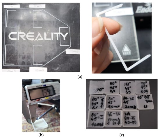 The following process parameters were kept constant during the print manufacturing: layer thickness: 0.1 mm; infill density: 100%; shells: 2; and tip/bottom layers: 2. The C-lines (Figure 1a) and the calibration cubes (Figure 1b,c) were measured and their quality was visually assessed. The following parameter settings ensured the best results: bed temperature of 45 °C for the first layer and 50 °C for the other layers; printing temperature of 80 °C for the first layer and 75 °C for the other layers; printing speed of 20 mm/s.