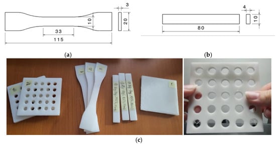 Three zig-zag specimens were exposed to UV-B for 9 h before the mechanical tests. For use in the testing of the thermoforming process, different samples with a rectangular shape (60 mm × 60 mm × 5 mm; 90 mm × 90 mm × 3 mm; 90 mm × 90 mm × 2 mm; 90 mm × 90 mm × 1.8 mm), with or without open pockets, were also manufactured using the same printing parameters. Figure 2 presents some of these specimens and samples (Figure 2c), as well as the dimensions of the tensile and flexural specimens (Figure 2a,b).