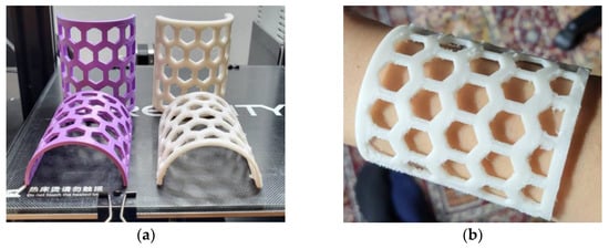 Additionally, semi-cylindrical samples with a 50 mm diameter, 70 mm height, and different thicknesses (2 mm, 3mm, and 4 mm), as well as 6 mm hexagonal open pockets, were 3D-printed in a vertical position, using PCL and PLA (Devil Design, Mikołów, Poland) (Figure 3). Their design mimicked the typical design of 3DP WHOs in the forearm section.