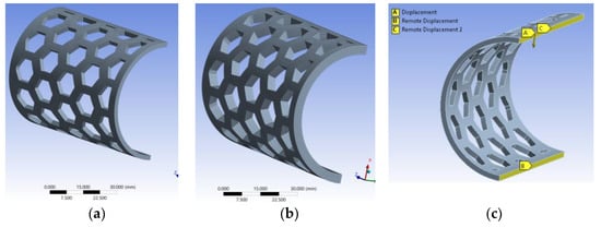 Meshing the models: 2 mm thick model (a); 4 mm thick model (b); external displacement and constraints (c).