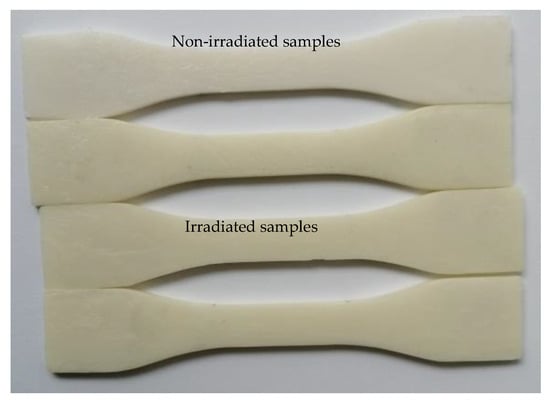 In [], injected molded PCL samples were subjected to UV-B exposure for up to nine weeks and then characterized, with photodegradation being observed. In our case, even for a much shorter period of exposure, a slight change in the color of the specimens was visible as well (Figure 8). No degradation of the surface (cracks, increase in the roughness) was noticed. As mentioned in Franca et al. [], the photodegradation mechanism can be attributed to the presence in the PCL polymer chain of chromophores that absorb radiation and start free radical oxidation, and then chain scission reactions [,].